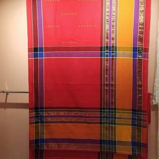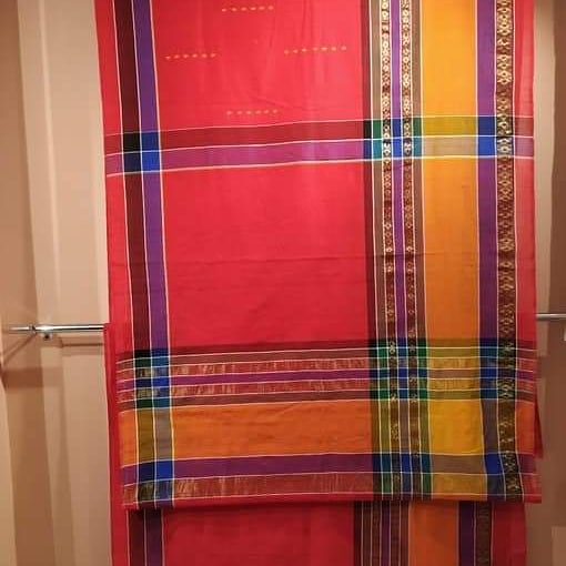 Cotton saree weaved by weavers of "Vidyashish Hathkargha, Anwa" by skillful combination of warp & weft on a handloom. Beautiful combination of one inch wide strips of six different colors having attractive Zari-Booti through dobby. Having Intricate designs made from Dobby/Jala technique. Popularly known as "ANWA SAREE".