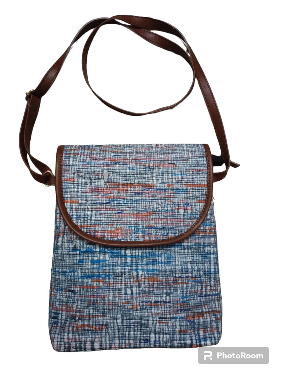 Upcycled plastic sling bag with premium quality rexin belt. It works as your Hands-Free companion throughtout your day or on your travel sprees!